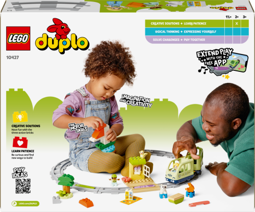 Hodiny kreatívneho hrania s interaktívnou stavebnicou s vláčikom Deti od 2 rokov sa so stavebnicou LEGO® DUPLO Interaktívny dobrodružný vláčik vydajú na inšpiratívne vzdelávacie dobrodružstvo Súčasťou tejto stavebnice sú 4 figúrky, vláčik, ktorý svieti a vydáva zvuky, 3 modely destinácií stavitelia prehĺbia schopnosť riešenia problémov, keď sa budú rozhodovať, čo si zbaliť na cestu, a potom postavia trasu k železničnej stanici, k parku alebo na pláž 3 akčné kocky ležia na trati a vláčik, ktorý na funkciu vyžaduje 4 batérie LR03 (AAA) (nie sú súčasťou balenia), po ich prejdení začne svietiť a vydávať zvuky