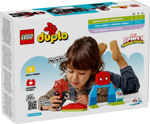 So stavebnicou LEGO® DUPLO® Marvel (10424) Spin a dobrodružstvo na motorke sa malé deti vydajú na superhrdinskú akciu. Táto vzdelávacia hračka umožní malým staviteľom od 2 rokov zachrániť svet a postaviť si scény inšpirované seriálom Spidey a jeho úžasní priatelia z dielne štúdia Disney+. Táto fantasy stavebnica so Spideym je ideálna na krátke zábavné hranie na každý deň. Obsahuje figúrku LEGO DUPLO Spina, hračku motorky a zostaviteľnú základňu. Malé deti Spina usadia na motorku, prejdú po rampe a vrhnú sa s ním do akcie. Uprostred boja pomôžu figúrke Spina vyhnúť sa letiacim kockám tým, že ich chytia do pavučiny. Táto kreatívna vzdelávacia hračka pomáha rozvíjať logické myslenie a jemné motorické schopnosti detí, ktoré si pri stavaní jednotlivých prvkov vymyslia sled udalostí. Malí stavitelia si precvičia sebavyjadrenie rozpoznávaním emócií, ktoré Spin počas deja môže prežívať, čo im pomôže pochopiť vlastné pocity.