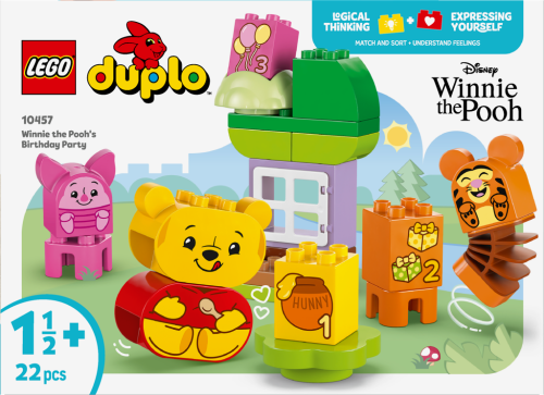 Batoľatá si so stavebnicou LEGO® DUPLO Disney Narodeninová oslava Macka Pú užijú oslavu, hranie a precvičovanie základných zručností 3 zostaviteľné modely zvieratiekLEGO® DUPLO Disney: Medvedík Pú, Tiger a Prasiatko, darčeky a domček na strome, ktorý podnecuje tvár, ktorá deťom, ktoré ešte nehovoria, umožní preskúmať rôzne emócie počas oslavy Batoľatá zdokonalí svoju zručnosť párovania zostaviteľných narodeninových darčekov a stoličiek s farbami postavičiek