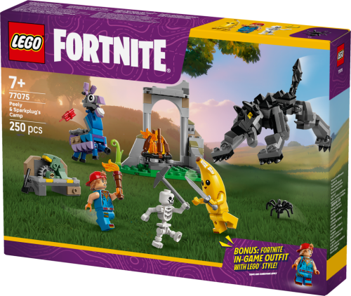 Nadchnite milovníkov videohier stavebnicou LEGO® Fortnite® (77075) Peely a Sparkplug a ich táborisko pre deti od 7 rokov. Táto videoherná stavebnica je plná známych prvkov a postáv z hry a inšpiruje fanúšikov na vytvorenie vlastného dobrodružstva vo svete LEGO Fortnite. Stavebnica je inšpirovaná prvými výzvami, s ktorými sa hráči stretávajú vo videohre LEGO Fortnite Odyssey. Chalani a dievčatá si užijú zábavu pri stavaní táboriska, pracovného stola a rozvalín, ktoré je možné rozobrať a prestaviť. Nechýba figúrka Supply Llamy a figúrka vlka s pohyblivým chvostom a nohami. Stavebnici vdychujú život minifigúrky Peelyho, Sparkplug a kostlivcov, ktoré majú doplnky v podobe zbraní, a podnecujú ku kreatívnemu hraniu. Táto videoherná stavebnica poslúži ako krásny darček pre deti a gamery všetkých vekových kategórií. Súčasťou je herný bonus do videohry LEGO Fortnite v podobe špeciálneho outfitu pre Sparkplug, ktorý si stavitelia odomknú naskenovaním QR kódu na obale návodu na stavanie. Stavebnica sa skladá z 250 dielikov.