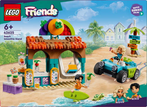 "Inšpirujte deti ku kreativite so stavebnicou LEGO® Friends (42625) Plážový stánok so smoothies pre deti od 6 rokov. Súčasťou stavebnice je model stánku so smoothies, plážová bugina a minibábiky LEGO Friends Nova a Niko. Deti skombinujú rôzne prísady, príbeh, v ktorom Nova s Nikom odpočívajú s nápojom na hojdačke a potom sa vydávajú preskúmavať okolie v plážovej bugine. Súčasťou tejto stavebnice LEGO je množstvo doplnkov, ktoré podnecujú kreatívne hranie, vrátane jedálneho lístka, surfovacej dosky, plného príbehov s kamarátmi. Táto stavebnica je kompatibilná s aplikáciou LEGO Builder, ktorá prináša intuitívne staviteľské dobrodružstvo. V nej môžu deti približovať a otáčať modely v 3D, ukladať svoje stavebnice a sledovať svoj postup.“