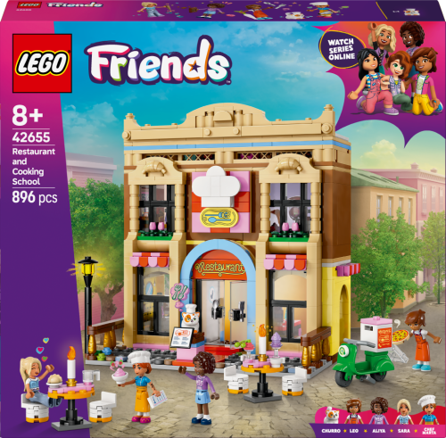 Stavebnica Reštaurácia a škola varenia pre deti od 8 rokov obsahuje veľa dielikov v podobe jedla, 4 minibábiky, figúrku mačky a skúter Táto stavebnica z prostredia reštaurácie inšpiruje k rozprávaniu príbehov zo školy varenia a obsahuje ingrediencie, ktoré deti skombinujú pri vytváraní vlastných receptov, ktoré potom môžu vyskúšať. vymeniteľné tváre, aby deti mohli zmeniť ich výraz pri ochutnávaní jedla Medzi doplnkami reštaurácie nájdete jedálne lístky, rúru, poznámkový blok, strúhadlo na syr, mixér, robota, zdobiace vrecko, soľnička, korenička, metla a veľa ďalšieho