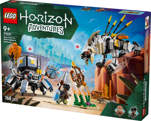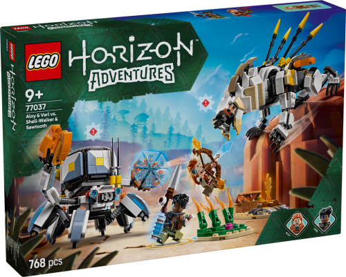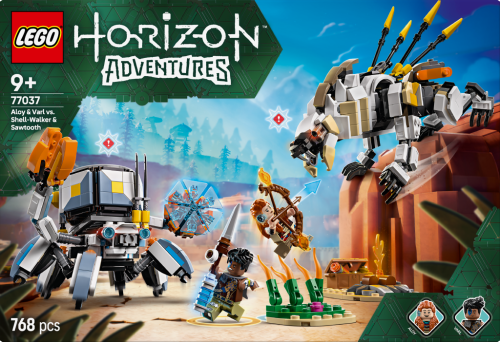 Stavebnice Aloy a Varl vs. Shell-Walker a Sawtooth je plná kreatívnej zábavy pre chlapcov a dievčatá od 9 rokov, ktorí milujú videohru LEGO® Horizon Adventures Súčasťou je minifigúrka Aloy držiaca lúk a minifigúrka Varla držiaca oštep Obe majú vylepšenia, ktoré sa k nim dajú pridať a umož Varlovi a budú spoločne bojovať proti 2 plne pohyblivým strojom, Shell-Walkerovi a Sawtoothovi, a vymenia prvky na ich zbraniach, čím aktivujú útoky ohňom, šokom a chladom Modely strojov Horizon – Shell-Walker má štít, energetický modul, pohyblivé nohy a ruky a otváracie pazúry a pohyblivýkrk, hlavu a nohy