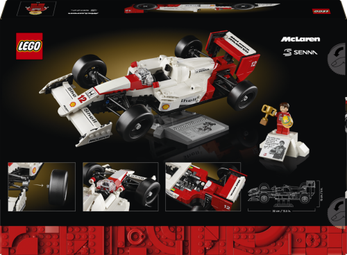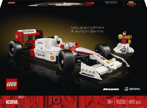 Stavebnica LEGO Icons McLaren MP4/4 a Ayrton Senna pre dospelých Súčasťou je replika vozidla McLaren MP4/4 a minifigúrka Ayrtona Senny Závodné auto LEGO Icons s funkčným riadením, spojovacou tyčou a hladkými pneumatikami Súčasťou je podstavec na vystavenie pre závodné auto a pre mini narodeninový darček milovníkom áut V aplikácii LEGO Builder nájdete digitálnu verziu návodu na stavanie Objavteinšpiratívny rad stavebníc LEGO navrhnutých pre dospelých Meria cez 12 cm na výšku, 32 cm na dĺžku a 17 cm na šírku