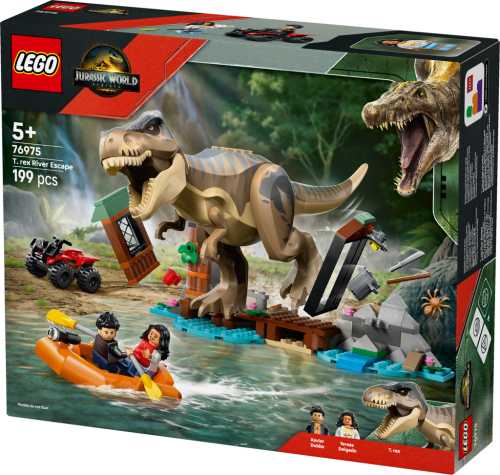 Deti a filmoví fanúšikovia od 5 rokov si pripomenú napínavú scénu z filmu Jurassic World: Rebirth alebo si vymyslia vlastné dinosaurie príbehy s prepracovanou stavebnicou LEGO® Jurassic World (76975) T-rex a útek po rieke. Táto ľahko zostaviteľná stavebnica poslúži ako krásny darček k narodeninám a obsahuje tvarovanú figúrku T-rexe pre deti s pohyblivými pažami, nohami, chvostom, hlavou a čeľusťou, ak tomu navyše 2 minifigúrky: Teresu Delgadovú a Xaviera Dobbsa. Nechýba kôlňa, ktorú je možné „zničiť“, vystreľovač lode, loďka, štvorkolka a množstvo ďalšieho.