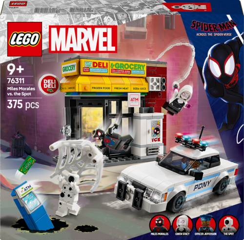 Stavebnica Spider-Verse: Miles Morales vs. Fľak je navrhnutý pre chlapcov a dievčatá od 9 rokov a je inšpirovaný filmom Spider-Man: Naprieč paralelnými svetmi od štúdia Marvel Stavebnica so Spider-Manom obsahuje minifigúrky Milesa Moralesa, Fľaka, Gwen Stacyovej a strážnika Jeffersona a doplnky vrátane pavučiny Funkcia explodujúcej zdi inšpiruje k nekonečným nápaditým dobrodružstvám Policajné vozidlo strážnika Jeffersona je možné otvoriť a umiestniť do neho 2 minifigúrky