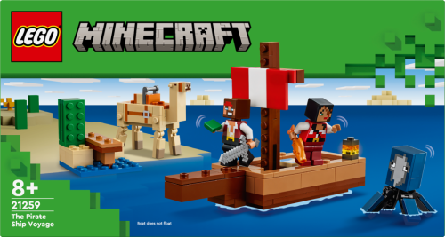 Plavba na pirátskej lodi (21259) je dobrodružná stavebnica z radu LEGO® Minecraft®. Stavitelia sa s ňou môžu hrať samostatne alebo ju skombinovať s ďalšími stavebnicami (predávajú sa samostatne) pre ešte zábavnejší zážitok z hry. Táto všestranná stavebnica pirátskej lode poteší každého fanúšika Minecraftu od 8 rokov a deti, ktoré majú rady lode a stavanie. Táto dobrodružná pirátska stavebnica LEGO Minecraft obsahuje zostaviteľnú loď, kalmáre, ťavy, 2 figúrky pirátov a doplnky. Táto špeciálna stavebnica LEGO s pirátmi, loďou a vôbec prvým dospelým ťavom v rade LEGO Minecraft poteší každého fanúšika Minecraftu. Na dvojité sedadlo ťavy sa zmestia obaja piráti, ktorí spolu vyrazia na ďalšie dobrodružstvo. Doplnky vrátane ryby, mapy, železného meča a kaktusu podnecujú nápadité hranie. Stavebnicu je možné kombinovať s ďalšími sadami LEGO Minecraft (predávajú sa samostatne) pre ešte viac herných možností.