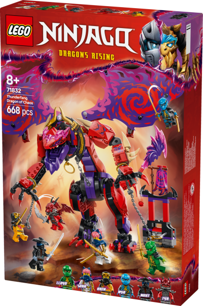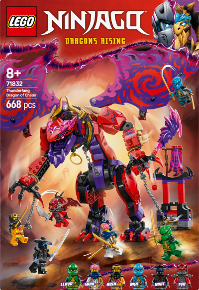 So stavebnicou Drak chaosu Thunderfang si chlapci a dievčatá od 8 rokov pripomenú scény z 3. radu televízneho seriálu NINJAGO Dračie povstanie Tento veľký drak má pohyblivý chvost, nohy, krídla, chodidlá, hlavu a čeľusť a pod oboma krídlami nájdete ich pripevnený k menšiemu modelu a je možné ho uvoľniť odomknutím 2 prizmatickými čepeľami 6 minifigúrok NINJAGO – obsahuje nindža bojovníkov Lloyda, Nyu, Arina a Soru a Nokta a Tyra, ktorý je vodcom dračích stvorení, takže si deti môžu zins