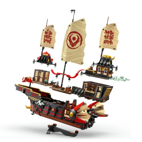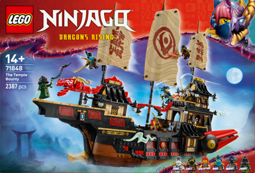 Starší fanúšikovia NINJAGO® od 14 rokov čaká úžasný model lode do zbierky: LEGO® NINJAGO (71848) Chrámová Odmena. Tento veľký a prepracovaný model lode je najnovším prírastkom do radu slávnych lodí NINJAGO a je plný skvelých detailov a funkcií. Súčasťou je tiež podstavec na vystavenie, takže fanúšikovia môžu model ľahko vystaviť na polici alebo napríklad na nočnom stolíku. Táto interaktívna dobrodružná stavebnica obsahuje všetko, čo fanúšikovia nindžov potrebujú na to, aby si pripomenuli príbehy z 3. radu televízneho seriálu NINJAGO Dračie povstanie: ozubené koleso pre otváranie a zatváranie plachiet, odnímateľné strechy a podlahy pre prístup do sushi je možné sklopiť a odhaliť tak tajný počítač. Stavebnica obsahuje tiež 6 minifigúrok: Zanea, Colea, Wyldfyre, Nyu, Roguea a zlotrilého Zarkta, ktorí majú vlastné nindžovské zbrane. Nindžovia majú priesvitnú čepeľ, ktorá pomáha odhaliť tajnú mapu na kapitánovom stole. Stavebnica obsahuje 2387 dielikov.