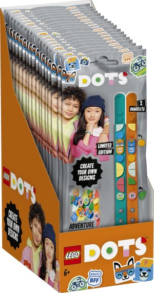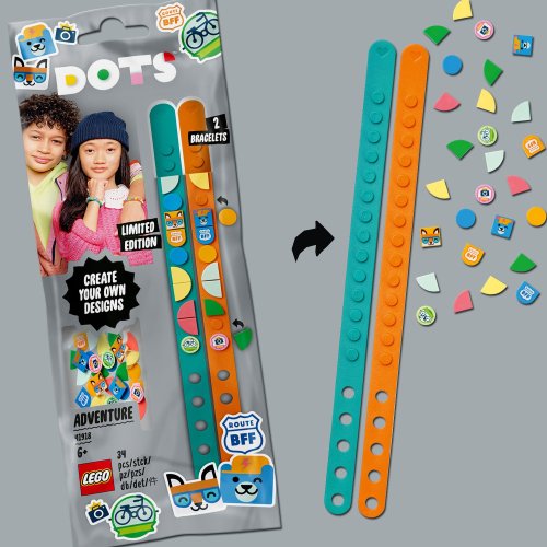 Rozžiarte tvár svojmu malému milovníkovi vlastnoručnej výroby s touto zábavnou súpravou náramkov dobrodružstva od LEGO® DOTS, ktorá obsahuje 2 základné náramky a 32 farebných dielikov s dobrodružnou potlačou.