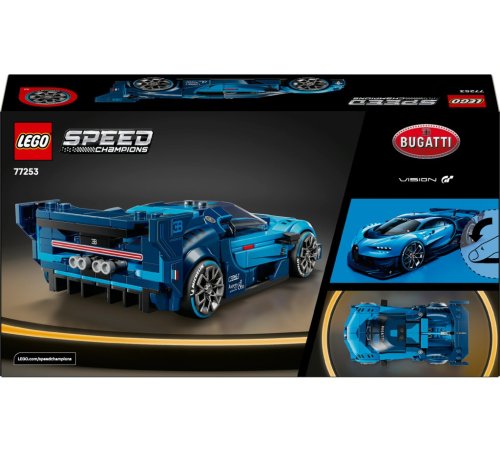 LEGO® Speed Champions 77253 predstavuje detailný model hyperšportového auta Bugatti Vision Gran Turismo, ktorý je určený pre deti od 9 rokov a staršie. Tento stavebnicový set obsahuje 284 dielikov, ktoré umožňujú postaviť vernú repliku luxusného vozidla navrhnutého automobilkou Bugatti pre videohru Gran Turismo z roku 2015. Model vyniká svojim výrazným modrým prevedením, ktoré je doplnené o rad autentických detailov, ako je predná maska v tvare podkovy s číslom 1 výrazné zadné krídlo. Široké pneumatiky s potlačou značky Michelin prispievajú k realistickému vzhľadu vozidla.