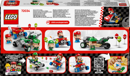 Vychutnajte si akčné praskanie balónikov a pretekanie so setom Baby Mario vs. Baby Luigi (72034) pre deti. Tento zábavný narodeninový darček Mario Kart™ pre chlapcov, dievčatá a gamery od 8 rokov obsahuje 2 zberateľské figúrky Nintendo – Baby Maria a Baby Luigiho – a ich vozidlá Biddybuggy a Tri-Speeder. Obe zostaviteľné vozidlá strieľajú panciere – môžete mieriť na 6 zostaviteľných balónikov (3 červené, 3 zelené). Komu sa podarí prevrhnúť balóniky ako prvé? Umiestnite figúrku LEGO® Mario™, LEGO® Luigi™ alebo LEGO® Peach™ (zo setov 71439, 71440 alebo 71441 – predávajú sa samostatne) do jednej z motokár na interaktívne hranie, čím sa spustia zvukové a vizuálne efekty Mario Kart, vrátane zvuku pre štart. Návod na stavanie pre tento set Nintendo nájdete v krabici alebo v aplikácii LEGO® Super Mario™. Prezrite si aj na ďalšie sety LEGO Super Mario: Mario Kart (predávajú sa samostatne), s ktorými môžete pretekať a bojovať s ďalšími postavami a vozidlami.