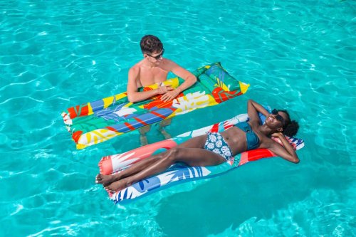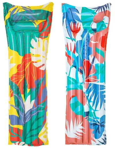 Nafukovacie lehátko s farebnou potlačou kvetinovými vzormi as nafukovacím vankúšom má rozmery 183 x 69 cm. Lehátko má zosilnené steny pre väčšiu odolnosť proti poškodeniu.