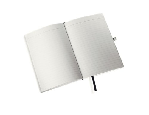 Prémiový zápisník s mäkkými doskami. Formát A5, linajkový. Uzatváranie na gumičku, úchyt na pero a vnútorné vrecko na voľné papiere.