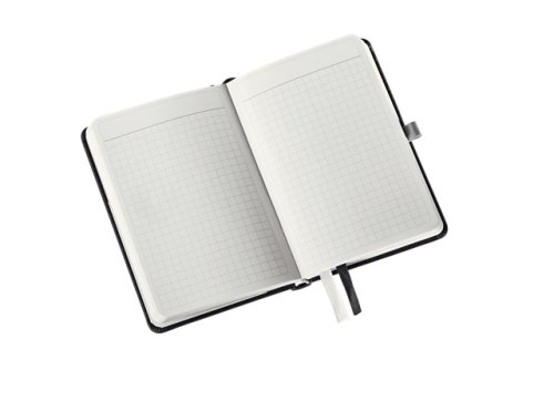 Prémiový zápisník s tvrdými doskami. Formát A6, štvorčekový. Uzatváranie na gumičku, úchyt na pero a vnútorné vrecká na voľné papiere.