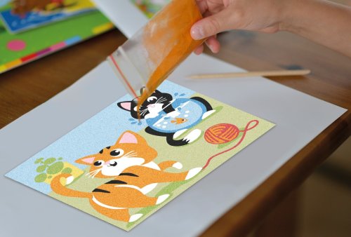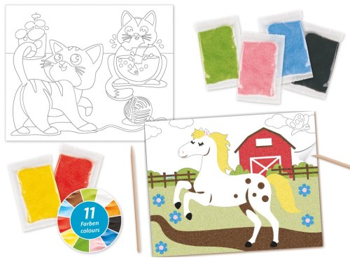 Táto nenáročná kreatívna práca vyžaduje sústredenie a zručnosť. Budete nadšení nádherným výsledkom. Súprava obsahuje 2 motívy, kone a mačky . Piesok v 11 farbách, ktorý sa sype na lepiaci podklad, na vytvorenie farebného obrázku. Hlavné vlastnosti: ideálny pre rozvíjanie zručnosti a kreativity podporuje zmyslový a hmatový rozvoj jednoduché použitie motivy zvierat2 motívy, 11 farieb
