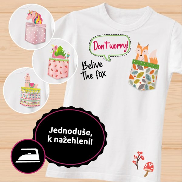 Navrhnite a dotvorte si svoje obľúbené tričká pomocou jedinečnej a bohatej sady fixiek na textil a nažehľovacích ozdôb. Potlač s roztomilými zvieratkami poteší a pobaví malých aj veľkých. Podrobný návod Vás prevedie celým postupom zdobenia, a potom už je to len na Vašej fantázii! Hlavné vlastnosti: 4 kapsičky, 4 dekoračné pásky, 4 potlače a 3 fixy jednoduchá aplikácia nažehlením