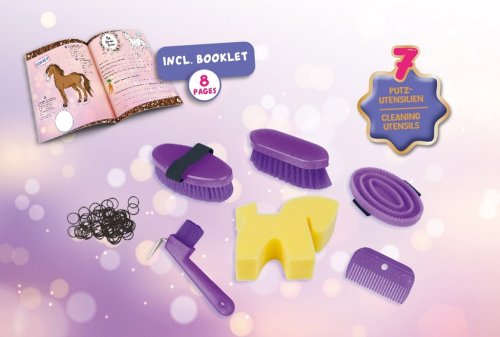 Praktická sada na čistenie koní poteší všetkých malých milovníkov koní a každodennej starostlivosti o nich. Deti si môžu vlastnoručne vyhrebeľcovať svojho poníka alebo koňa, o ktorého sa následne môžu starať s profesionálnym vybavením. Sada obsahuje všetko potrebné pre základnú údržbu – škrabka na kopytá, huba v tvare koňa, hrebeň na hrivu, hrebeň na srsť a dve rôzne kefy. Stačí sa pustiť do práce a vďaka ergonomickým tvarom prispôsobeným detskej ruke si užiť spoločné chvíle v stajni. Výsledkom je krásne čistý a spokojný kôň pripravený na vychádzku. Skvelá sada pre deti, ktoré chcú mať vlastnú výbavu a zažiť radosť zo skutočnej starostlivosti o zvieratá . Hlavné vlastnosti: kompletná sada pre základnú starostlivosť o koňasada obsahuje - škrabku, špongiu, 2x hrebeň a dve rôzne kefypraktický box s uchemideálnou veľkosť pre detské rukypodporuje zodpovednosť a vzťah k zvieratámjednoduchá údržba vďaka odolnému plastuideálne ako darček pre malých jazdcov a jazdkynevhodné