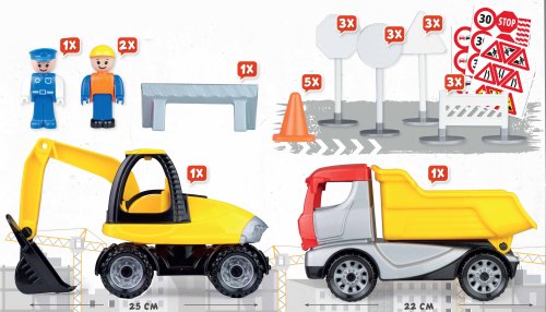 Stavebný set obsahuje: sklápačka 22 cm, bager 25 cm, 17 x dopravné značenie, dopravná zábrana, 3 x panáčik, kvalitný plast s pevnou stavbou, v krabici 38 x 10 x 28 cm. Vhodné pre deti od 2 rokov.