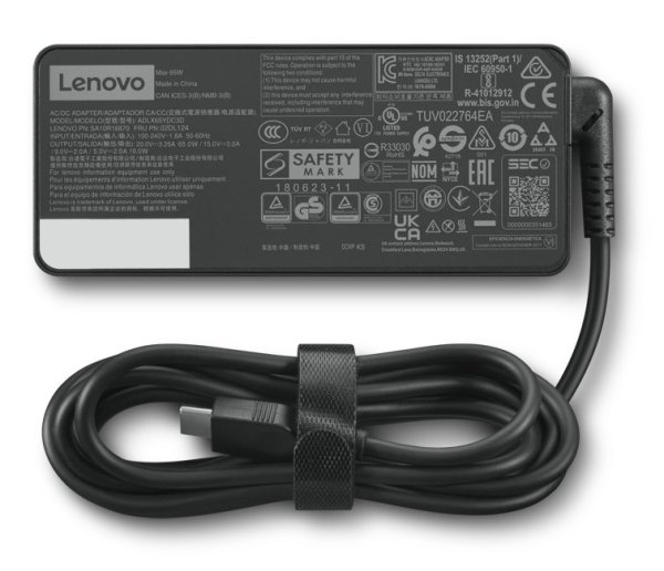 Napájací adaptér s výkonom 65 W a konektorom USB-C pre notebooky Lenovo. Napájací kábel do siete je súčasťou balenia.