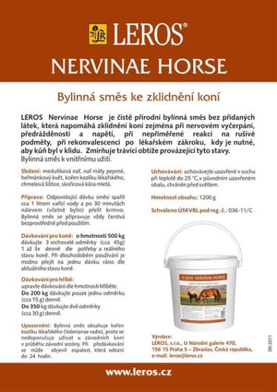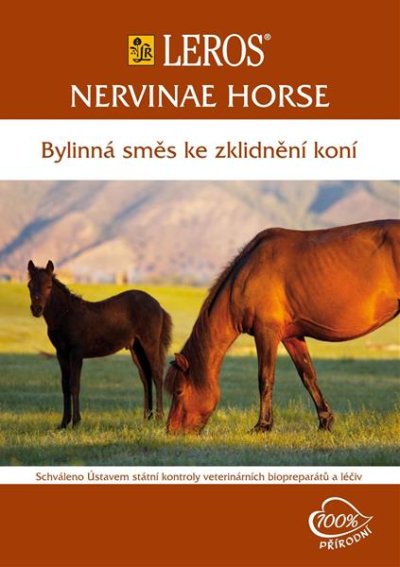 Bylinná zmes Nervinae Horse Upokojenie napomáha upokojiť kone pri nervovom vyčerpaní, pri podráždenosti a napätí, pri neprimeranej reakcii na rušivé podnety alebo pri rekonvalescencii po lekárskom zákroku. Vhodná podpora pred stresovými situáciami a počas nich, pri zmene prostredia a začleňovania koňa do stáda. Zlepšuje sústredenie, zmierňuje strach a úľakové reakcie. Čisto prírodné zloženie bez obsahu konzervantov, lepku a umelých sladidiel. Zloženie: medovková vňať (35 %), vňať mäty piepornej (20 %), harmančekový kvet (16 %), koreň valeriány lekárskej (16 %), chmeľová šištice (10 %), škoricová kôra mletá (3 %). Dávkovanie: dospelý kôň s hmotnosťou cca 500 kg: cca 45 g (3 vrchovaté odmerky) 1–3× denne podľa potreby a reálneho stavu koňa. Pri dlhodobom používaní je možné prejsť na jednu dávku ráno podľa aktuálneho stavu koňa. žriebä do hmotnosti 200 kg: cca 15 g (1 odmerka) 1–3× denne žriebä do hmotnosti 350 kg: cca 30 g (2 odmerky) 1–3× denne Spôsob použitia: Zodpovedajúcu dávku zmesi sparte cca 1 litrom vriacej vody a po 30 minútach nálevom (vrátane bylín. Bylinná zmes sa pripravuje vždy čerstvá bezprostredne pred použitím. Upozornenie: Bylinná zmes obsahuje koreň valeriány lekárskej ( Valerianae radix ), a preto sa neodporúča užívať u závodných koní v priebehu závodnej sezóny. Pri predávkovaní sa môže objaviť ospalosť, ktorá odznie do 24 hodín. Určené iba pre zvieratá.