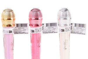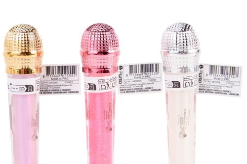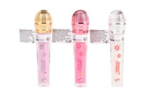 Lesk na pery v tvare mikrofónu.tylový lesk na pery ukrytý v originálnom obale v tvare mikrofónu. Poskytuje jemný lesk a príjemnú starostlivosť pre pery, ideálny pre malých fanúšikov make-upu a spevu. V troch farbách ružovo/zlatý, ružovo/strieborný a ružovo/ružový.