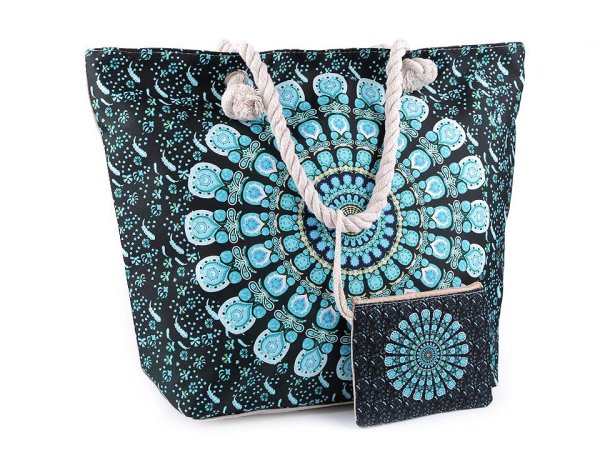 Veľkú bavlnenú tašku s potlačou mandaly využijete pri ceste na kúpalisko aj na pláž. Vďaka rozšírenému dnu dobre stojí. Súčasťou je aj malá taštička na drobnosti v rovnakom dizajne, ktorá je pripevnená k uchu. Pokiaľ jej pútko prevlečiete dierkou pri uchu tašky, môžete ju zložiť a nosiť samostatne. Taška je priestranná - zmestí sa do nej všetko, čo potrebujete. Vnútri sa nachádza polyesterová podšívka s malým vreckom. Hore sa dá taška uzavrieť pomocou zipsu. Vďaka veľkým uchom z krútenej šnúry môžete niesť tašku pohodlne v ruke aj na ramene. Potlač na taške aj taštičke je iba na prednej strane, zadná strana je prírodná.