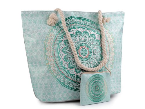 Veľkú bavlnenú tašku s potlačou mandaly využijete pri ceste na kúpalisko aj na pláž. Vďaka rozšírenému dnu dobre stojí. Súčasťou je aj malá taštička na drobnosti v rovnakom dizajne, ktorá je pripevnená k uchu. Pokiaľ jej pútko prevlečiete dierkou pri uchu tašky, môžete ju zložiť a nosiť samostatne. Taška je priestranná - zmestí sa do nej všetko, čo potrebujete. Vnútri sa nachádza polyesterová podšívka s malým vreckom. Hore sa dá taška uzavrieť pomocou zipsu. Vďaka veľkým uchom z krútenej šnúry môžete niesť tašku pohodlne v ruke aj na ramene. Potlač na taške aj taštičke je iba na prednej strane, zadná strana je prírodná.