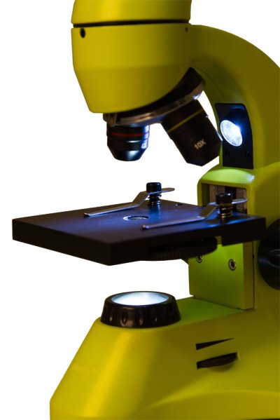 Mikroskop je vybavený dvoma jasnými svetelnými zdrojmi na báze technológie LED. Na pozorovanie transparentných preparátov, ako sú mačacie chlpy alebo drobné kôrovce, použite spodné osvetlenie. Horné osvetlenie sa používa na nepriehľadné objekty – vlákna papiera, mince a množstvo ďalších zaujímavých predmetov. Polopriehľadné preparáty možno najlepšie pozorovať pri súčasne zapnutom hornom i spodnom osvetlení. Regulácia jasu vám umožňuje nastaviť pre každý preparát optimálnu úroveň osvetlenia.