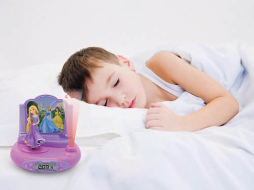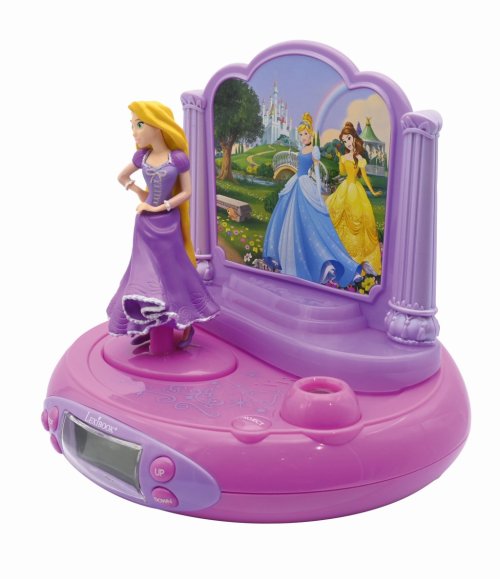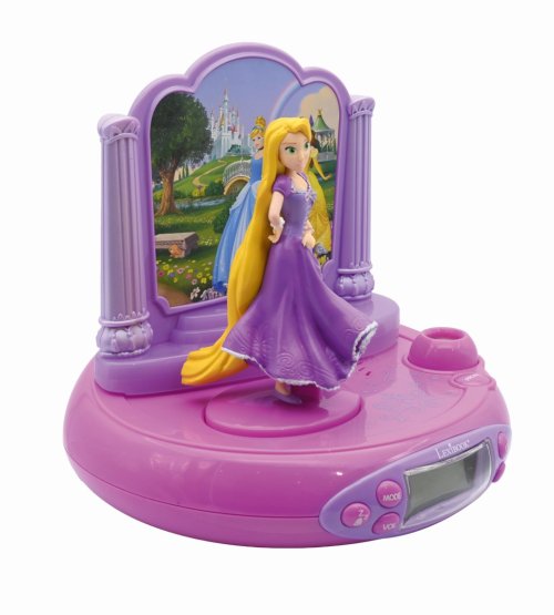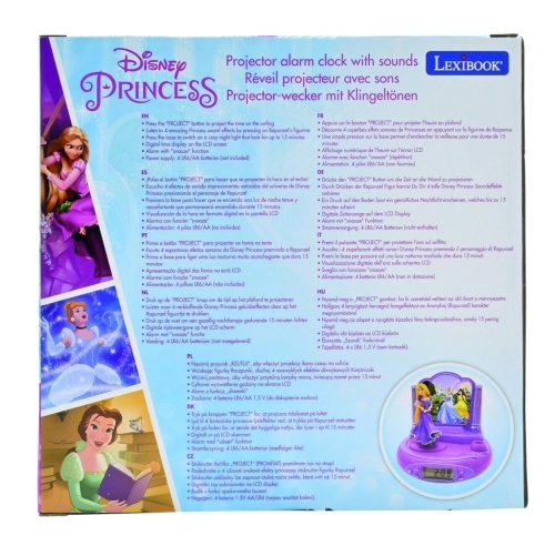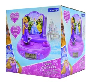 Budík Lexibook 3D Disney Princezné je navrhnutý ako zábavný a funkčný doplnok detskej izby, ktorý zaujme predovšetkým malé fanúšičky obľúbených Disney princezien. Jeho základ tvorí okrúhly fialovo-ružový podstavec, na ktorom je umiestnená detailne prevedená plastová figúrka princeznej Rapunzel v dlhých fialových šatách s bielymi ozdobami. Za figúrkou sa týči dekoratívny rámik v podobe zámku s farebným obrázkom ďalších dvoch princezien, Popolušky a Belle, uprostred zelenej krajiny s dúhou na oblohe. Tento motív dodáva budíku rozprávkovú atmosféru a vizuálne ho prepája s celou kolekciou Disney Princezné.