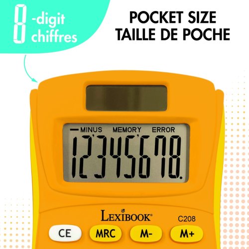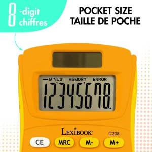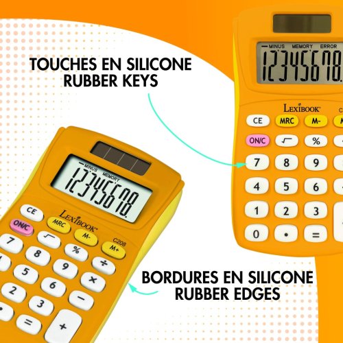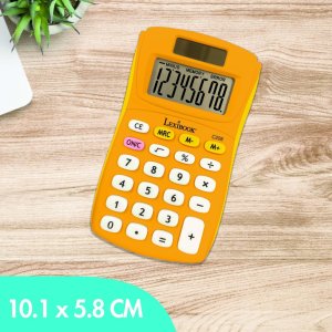 Vrecková kalkulačka Lexibook je navrhnutá s dôrazom na praktickosť a odolnosť, čo ju robí vhodnou na školské použitie aj každodenné výpočty. Má kompaktné rozmery 10,1 × 5,8 cm, vďaka čomu sa ľahko zmestí do vrecka alebo školskej peňaženky. Jej povrch je pokrytý gumovým silikónom, ktorý zaisťuje príjemný a bezpečný úchop, zároveň chráni zariadenie proti nárazom a poškodeniu. Tmavá žltá farba kalkulačky ju robí dobre viditeľnou a zároveň esteticky príťažlivou.