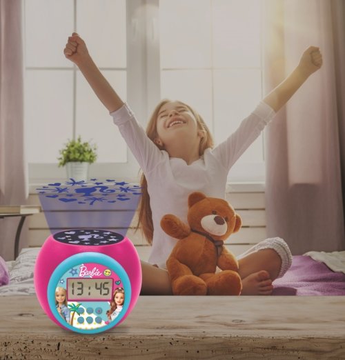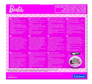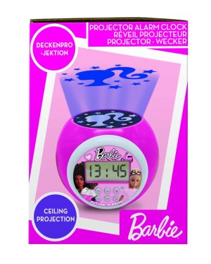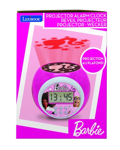 Lexibook budík Barbie so stropným projektorom je štýlový a funkčný budík určený predovšetkým pre deti a fanúšikov známej bábiky Barbie. Jeho dizajn je výrazne farebný, s ružovým guľatým telom a modrým rámčekom okolo digitálneho displeja, na ktorom sú zobrazené dve postavičky Barbie. Budík má moderný digitálny LCD displej ukazujúci čas v 24-hodinovom formáte. Ovládanie je riešené pomocou šiestich guľatých tlačidiel pod displejom, ktoré umožňujú nastavenie času, alarmu, minút a hodín, rovnako ako aktiváciu projekcie a ďalších funkcií.