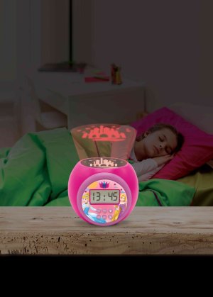 Unikátnym prvkom tohto budíka je stropný projektor, ktorý premieta na strop alebo stenu detskej izby siluetu rozprávkového hradu. Projektor ponúka možnosť časovača s tromi nastaveniami – 5, 15 alebo 30 minút – vďaka čomu môže slúžiť aj ako nočné svetlo, ktoré deťom pomáha zaspať. Projekcia vytvára príjemnú a upokojujúcu atmosféru v spálni, čo je dobre znázornené na ilustračných fotografiách.