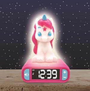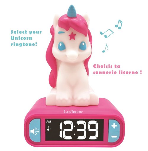 Lexibook budík Jednorožec so svietiacou figúrkou je kombináciou praktického budíka a nočnej lampičky, ktorá poteší najmä deti. Celý budík je navrhnutý v hravom a farebnom dizajne s postavičkou jednorožca, ktorá je bielej farby s ružovou hrivou a modrým rohom. Jednorožec je umiestnený na ružovom podstavci, na ktorom je zabudovaný digitálny displej s veľkými bielymi číslicami, ktoré sú na čiernom pozadí dobre čitateľné aj v tme vďaka podsvieteniu. Ovládacie tlačidlá sú farebne zladené do modra a umožňujú jednoduché nastavenie času a hlasitosti.