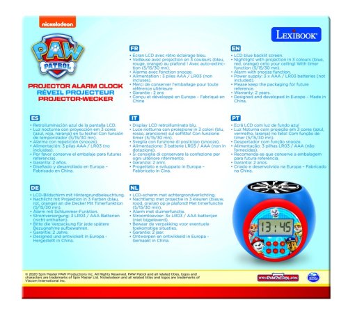 Budík Lexibook s motívom Labkovej patroly je určený predovšetkým deťom a kombinuje funkčnosť s obľúbenými postavičkami zo seriálu. Zaoblený dizajn budíka je ladený do modrej farby s červeným rámčekom okolo digitálneho displeja, ktorý zobrazuje čas v 24-hodinovom formáte. Na čelnej strane sú vyobrazené hlavné postavičky Paw Patrol, ktoré deťom spríjemnia každé zobudenie. Displej je podsvietený modrým svetlom, ktoré uľahčuje čítanie času aj za zníženej viditeľnosti.