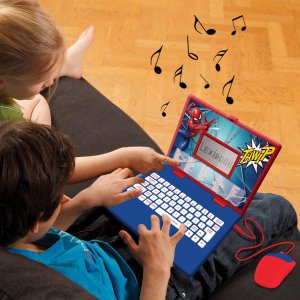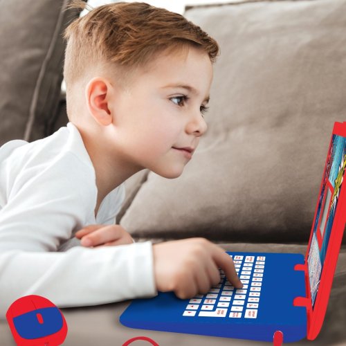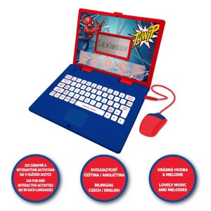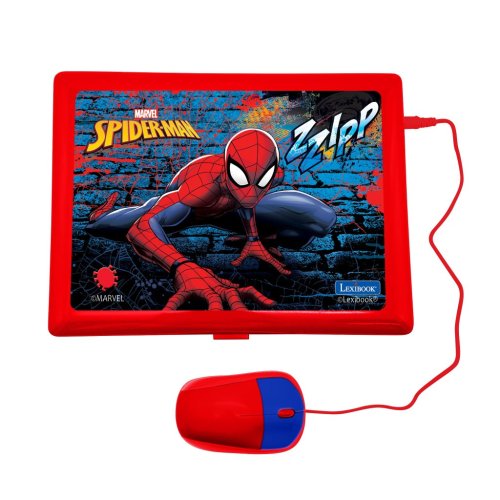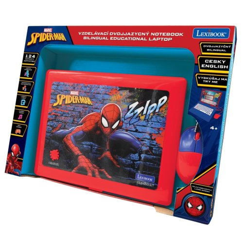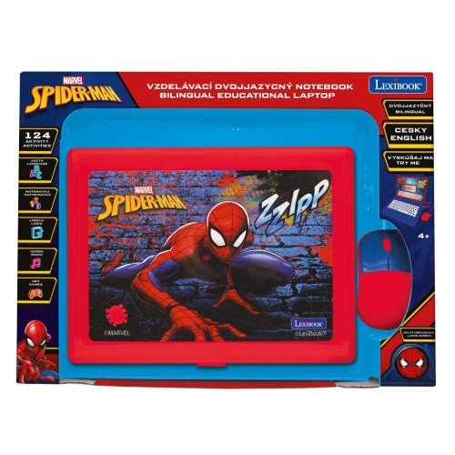 Lexibook česko-anglický vzdelávací notebook Spiderman je interaktívna elektronická hračka navrhnutá pre deti od 4 rokov, ktorá kombinuje zábavu s učením v obľúbenom motíve Marvel Spidermana. Notebook má pevnú konštrukciu v modro-červených farbách, ktoré zodpovedajú ikonickému kostýmu Spidermana. Na viečku je výrazný obrázok Spidermana v akčnej pozícii na pozadí štylizovanej steny, čo dodáva produktu atraktívny vzhľad pre malých fanúšikov tohto superhrdinu. Vďaka pripojenej myši, ktorá má tiež červeno-modré prevedenie, pripomína skutočný počítač a uľahčuje deťom ovládanie.