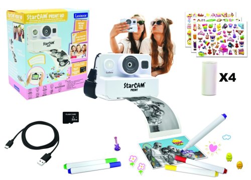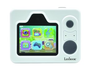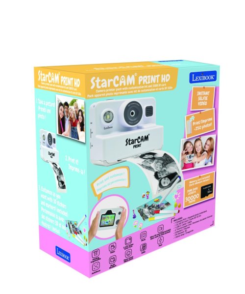 Lexibook detský instantný HD fotoaparát StarCAM s tlačiarňou je multifunkčná elektronická hračka určená pre deti, ktorá kombinuje zábavu s kreativitou. Tento kompaktný fotoaparát má moderný dizajn v bielej farbe s výrazným objektívom, ktorý ponúka 16-násobný digitálny zoom a svetelnosť f/2.6, čo umožňuje zhotovovať ostré a kvalitné snímky aj v rôznych svetelných podmienkach. Na prednej strane sa nachádza vstavaný blesk a reproduktor, ktorý dopĺňa interaktívny zážitok z používania. Fotoaparát je vybavený aj remienkom na jednoduché nosenie a ovládanie.