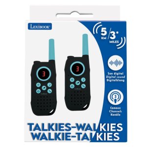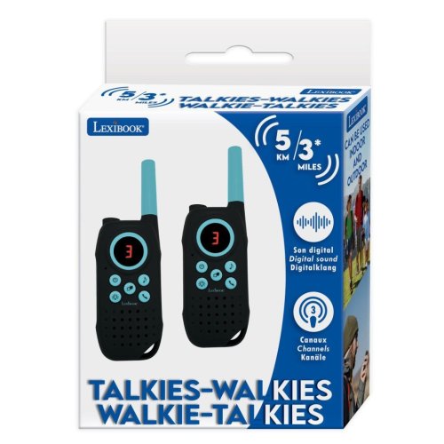 Digitálne vysielačky Lexibook sú navrhnuté tak, aby deťom aj dospelým umožnili jednoduchú a spoľahlivú komunikáciu na vzdialenosť až 5 km. Vysielačky majú kompaktný a ergonomický dizajn s čiernym telom a svetlomodrými tlačidlami a anténou, čo im dodáva moderný a prehľadný vzhľad. Na prednej strane nájdete jednoduché ovládacie prvky vrátane tlačidla zapnutia, regulácie hlasitosti, voľby kanála a tlačidla na zapnutie podsvietenia displeja. Displej ukazuje aktívny kanál červenými číslicami, čo uľahčuje rýchle nastavenie komunikácie.