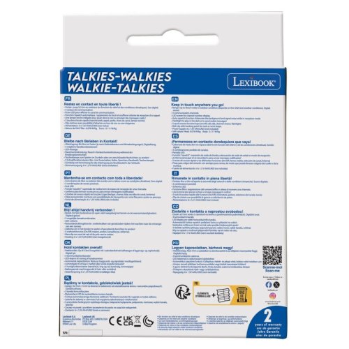 Na napájanie je potrebných šesť batérií typu AAA, ktoré nie sú súčasťou balenia, čo umožňuje jednoduchú výmenu a dlhodobé používanie. Na zadnej strane každej vysielačky je praktický klip na jednoduché pripnutie na opasok alebo batoh, čo zvyšuje ich mobilitu a komfort pri používaní. Vďaka svojim funkciám, vrátane digitálneho zvuku, možnosti voľby kanála a dosahu 5 km, predstavujú tieto Lexibook vysielačky spoľahlivý nástroj na komunikáciu na krátke vzdialenosti, ideálny pre aktívne rodiny aj deti pri rozvíjaní fantázie a kreativity.
