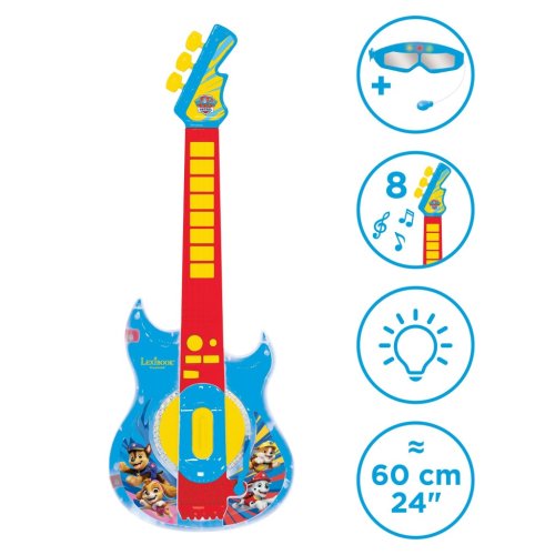 Elektronická svietiaca gitara Lexibook v motíve populárnej Tlapkovej patroly je určená pre malých hudobníkov od troch rokov veku. Gitara má dĺžku približne 60 cm a je vyrobená z plastu vo výrazných farbách – telo je modré s červeným krkom a žltými detailmi. Na tele gitary sú vyobrazení hlavní hrdinovia Tlapkovej patroly, čo ju robí atraktívnou pre deti, ktoré tento seriál poznajú a majú ho rady. Súčasťou sady sú aj modré okuliare s integrovaným mikrofónom, ktoré umožňujú deťom napodobňovať spev a cítiť sa ako skutoční interpreti.