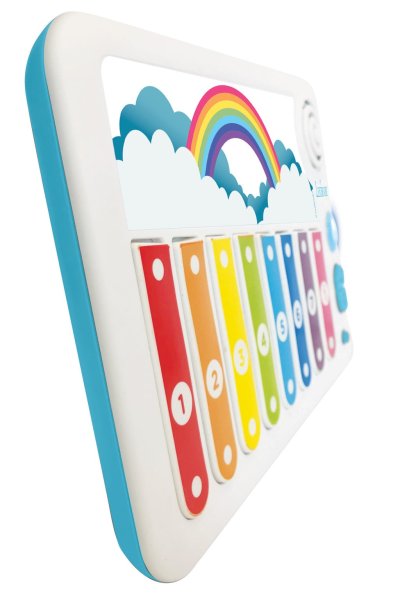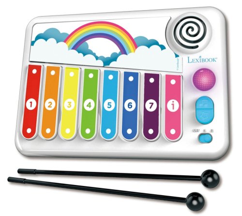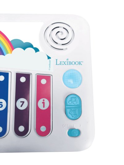 Elektronický xylofón Lexibook je navrhnutý pre deti od 3 rokov ako hudobná hračka, ktorá podporuje ich kreativitu a hudobné cítenie. Toto zariadenie má kompaktný a ergonomický dizajn s bielym telom a farebnými klávesami v dúhových odtieňoch, ktoré sú očíslované od 1 do 7 s doplnkovou klávesou označenou „i“. Nad klávesami je veselý motív dúhy a obláčikov, ktorý pridáva hravý vzhľad a vizuálne priťahuje pozornosť detí. Celý xylofón je vyrobený z kvalitného plastu a jeho zadná strana je modrá, čo zvyšuje jeho odolnosť a estetiku.