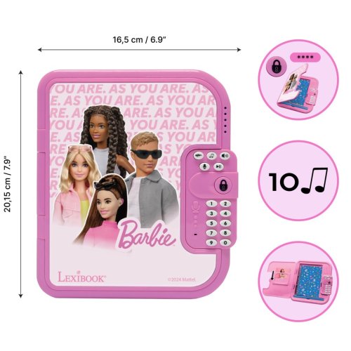 Lexibook elektronický tajný denník Barbie je moderná hračka určená deťom od 6 rokov, ktorá kombinuje klasický zápisník s elektronickou zábavou. Deník je vyrobený z ružového plastu a na jeho prednej strane sú vyobrazené obľúbené postavy zo sveta Barbie, čo z neho robí atraktívny doplnok pre malé fanúšičky tejto značky. Rozmery denníka sú 20,15 cm na výšku a 16,5 cm na šírku, čo umožňuje pohodlné prenášanie a manipuláciu. Súčasťou balenia je aj modrý zápisník s farebným motívom a perom, ktoré deťom umožňuje zaznamenávať svoje myšlienky a nápady tradičnou formou.