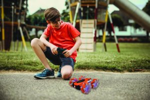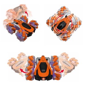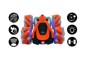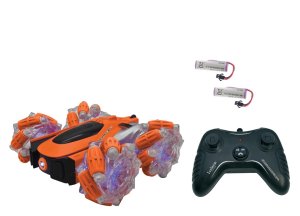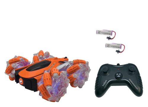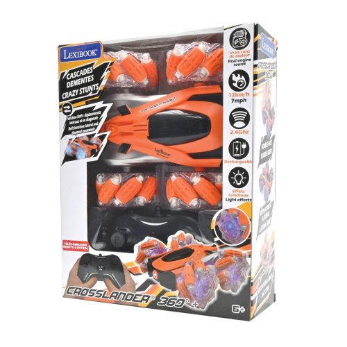 Lexibook kaskadérské auto Crosslander 360°+ je dálkově ovládané RC vozidlo navržené pro zábavu i náročné kaskadérské kousky. Auto má výrazný oranžovo-černý design s originálním tvarem a transparentními kola vybavenými modrými LED světly, která zajišťují atraktivní světelné efekty během jízdy. Díky speciálním kolům může vozidlo provádět pohyby v různých směrech, včetně bočního driftu i otáčení o 360 stupňů, což přináší jedinečný zážitek z jízdy a umožňuje realizovat různé kaskadérské triky.