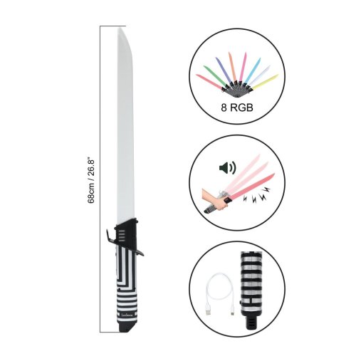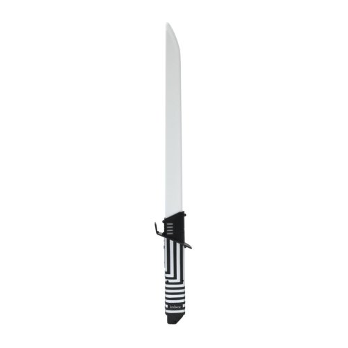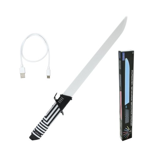 Rukoväť meča je ergonomicky tvarovaná a zdobená čiernobielou geometrickou vzorou, ktorá dodáva hračke moderný vzhľad. Súčasťou balenia je aj USB kábel na dobíjanie vstavanej NiMH batérie, čo zaisťuje pohodlné a ekologické napájanie bez nutnosti používania jednorazových batérií. Táto vlastnosť uľahčuje opakované používanie hračky a predlžuje jej životnosť.