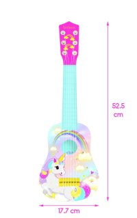 Dizajn gitary je výrazne farebný a príťažlivý, dominujú pastelové odtiene ružovej a fialovej. Povrch je zdobený motívom jednorožca, čo prináša hravý a fantazijný prvok, ktorý zaujme deti a môže ich motivovať k ďalšiemu hraniu. Gitara má šesť strún, ktoré sú pravdepodobne z mäkkého, deťom priateľského materiálu, čo zaisťuje bezpečnosť a ľahšie ovládanie.