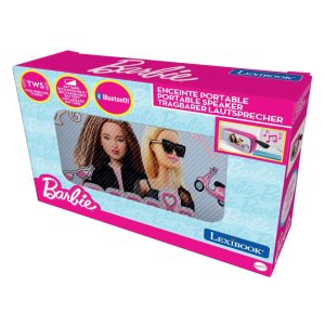 Lexibook reproduktor Barbie je prenosné zariadenie navrhnuté špeciálne pre deti, ktoré spája obľúbený motív Barbie s modernými technológiami. Reproduktor je potiahnutý látkovým povrchom s motívom dvoch bábik Barbie na svetlomodrom pozadí doplnenom o rôzne ikonické symboly, ako sú okuliare, palmá, alebo skúter. Okraje reproduktora sú v žiarivej ružovej farbe, ktorá podčiarkuje hravý a atraktívny dizajn určený deťom. Jeho kompaktná veľkosť umožňuje ľahké prenášanie, čo uľahčuje použitie doma aj na cestách. Súčasťou je aj čierny popruh pre pohodlné uchytenie alebo zavesenie.