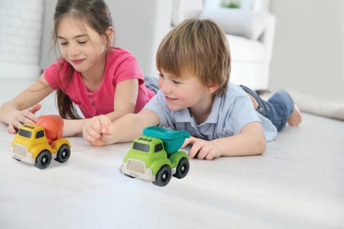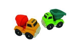 Súprava obsahuje žlté auto s červeným miešačom betónu a zelené auto s modrozelenou korbou. Obe vozidlá majú detailne prepracovanú kabínu, kolesá sú čierne s bielymi ráfikmi, čo umocňuje realistický vzhľad hračiek. Povrch áut je matný a príjemný na dotyk, čo podporuje detskú hru a manipuláciu. Hračky sú navrhnuté tak, aby podporili rozvoj hrubej motoriky, koordinácie ruky a oka a zároveň stimulovali kreativitu a predstavivosť predškolských detí.