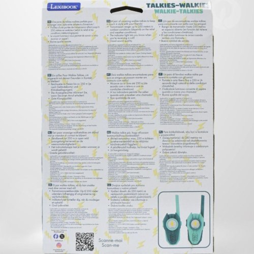 Balenie je navrhnuté tak, aby jasne prezentovalo obsah a funkcie vysielačiek, vrátane informácií o dosahu a odporúčanom veku. Vysielačky sú vyrobené z odolného plastu, ktorý zaisťuje dlhú životnosť aj pri aktívnom používaní. Celkovo vysielačky Lexibook spĺňajú požiadavky na bezpečnosť a kvalitu, sú určené na rozvoj elektronickej zábavy a komunikácie medzi deťmi. Tento produkt je vhodným doplnkom pre každé dieťa, ktoré rado objavuje svet prostredníctvom hry a interakcie s kamarátmi.