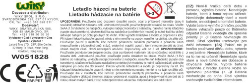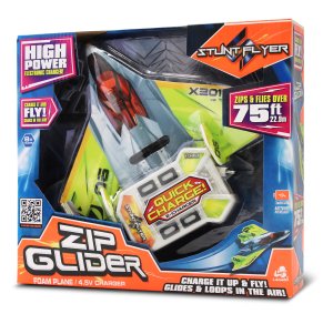Lietadlo hádzacie elektrické Zip Glider. Rozpätie krídiel 23cm. Dolet až 22,9 m. Lietadlo je rýchlodobíjacie. Návod na nabíjanie na zadnej strane obalu. Pripojte lietadlo na nabíjačku, cez nabíjací port na spodnej strane. Podržte tlačidlo na nabíjačke na 30 sekúnd. Odpojte z nabíjačky a môžete lietať. 4,5V nabíjačka. Lietadlo je penové. Batérie 3xAA/LR6 (1,5V), nie sú súčasťou balenia.
