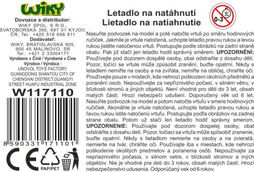 Nusuňte podvozok na model a potom natočte vrtuľu v smere hodinových ručičiek. Akonáhle je vrtuľa natočená, uchopte lietadlo pravou rukou a ľavou rukou istite natočenú vrtuľu. Postupujte podľa obrázkového návodu. Potom už stačí lietadlo hodiť správnym smerom. Veľkosť lietadla 22 x 22 cm. Rozmery balenia 26 x 30 x 4 cm. Vhodné pre deti od 3 rokov.